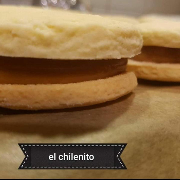 Galleta sándwich de alfajor relleno de manjar y decorado con chispas de coco.