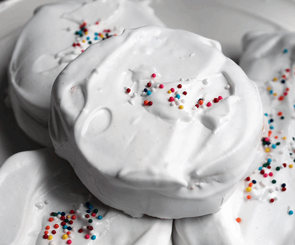 Galleta sándwich rellena de manjar y cubierto de merengue.