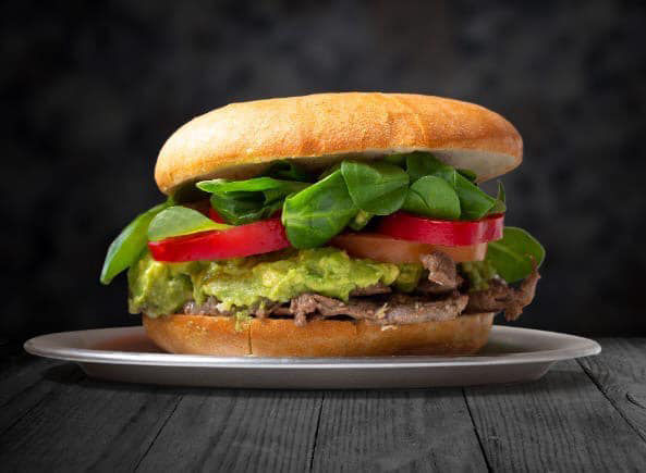 Sandwich 120 g Hüftsteak, Avocado, Tomate und Mayonnaise.